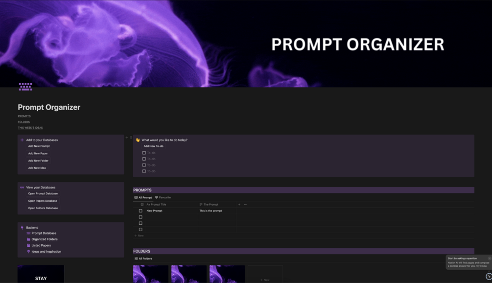 Access a Notion workspace for organizing prompts through folders and notes on important subjects.